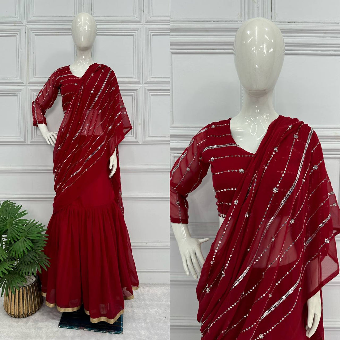 Traditional Lehenga Saree Set with Full Embroidery & Faux Georgette Blouse (Red)