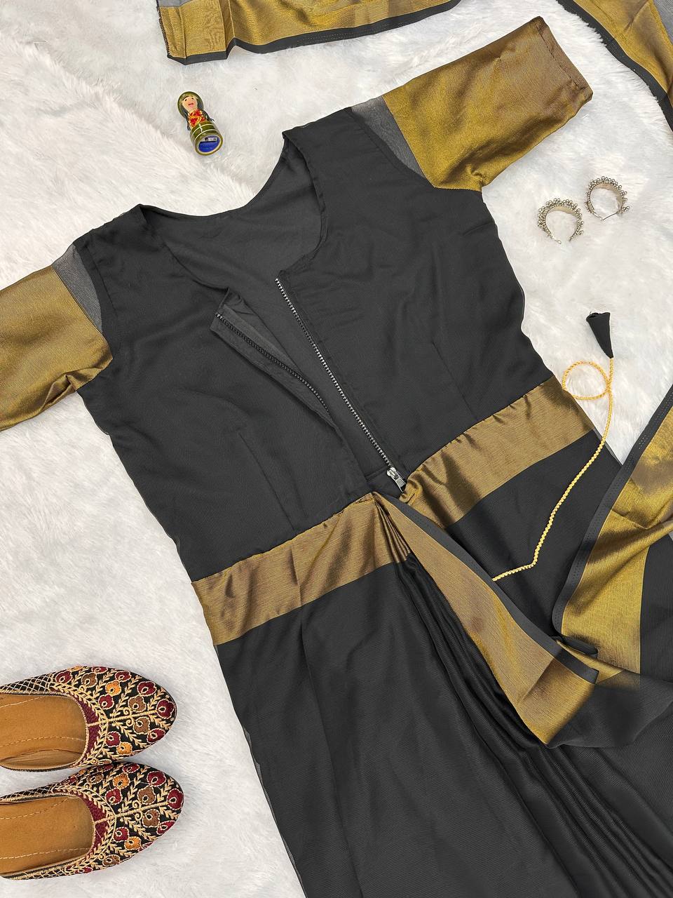 Chinon Zari Patta Ready-to-Wear Saree Gown with Zip & Go Style