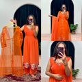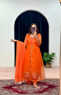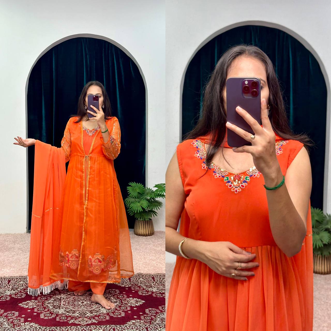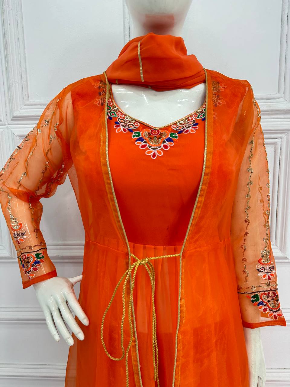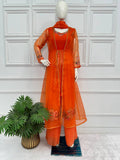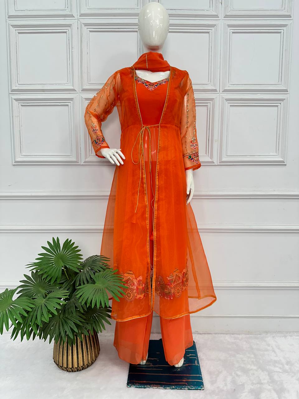 Designer Embroidered Kurti Set with Palazzo, Lace Dupatta & Organza Shrug (Orange)
