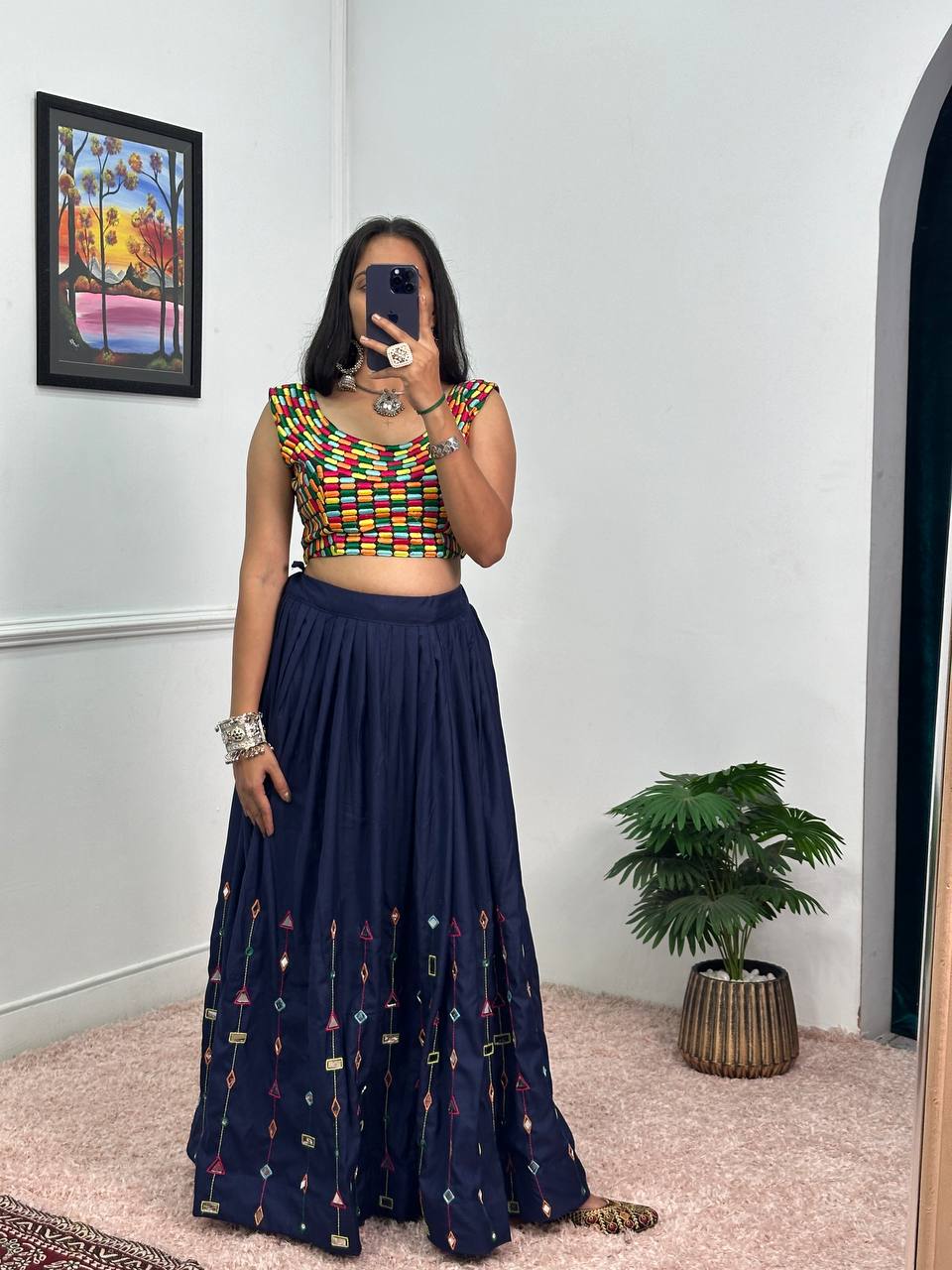 Designer Rayon Lehenga with 4 Meter Flair & Banglory Embroidered Blouse (Blue)