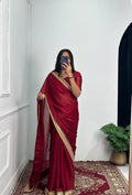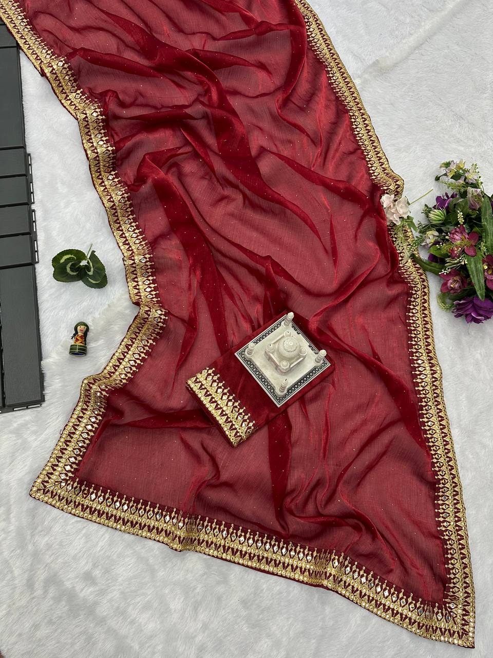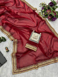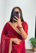 Elegant Burberry Saree with Foil & Zari Embroidery and Crystal Diamond Accents (Red)