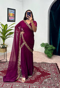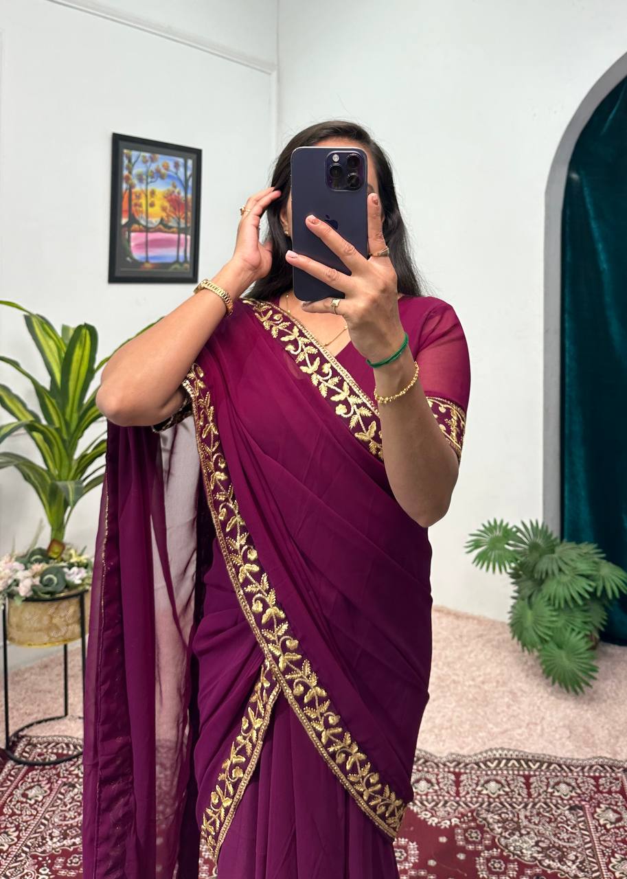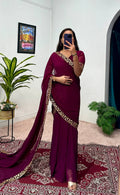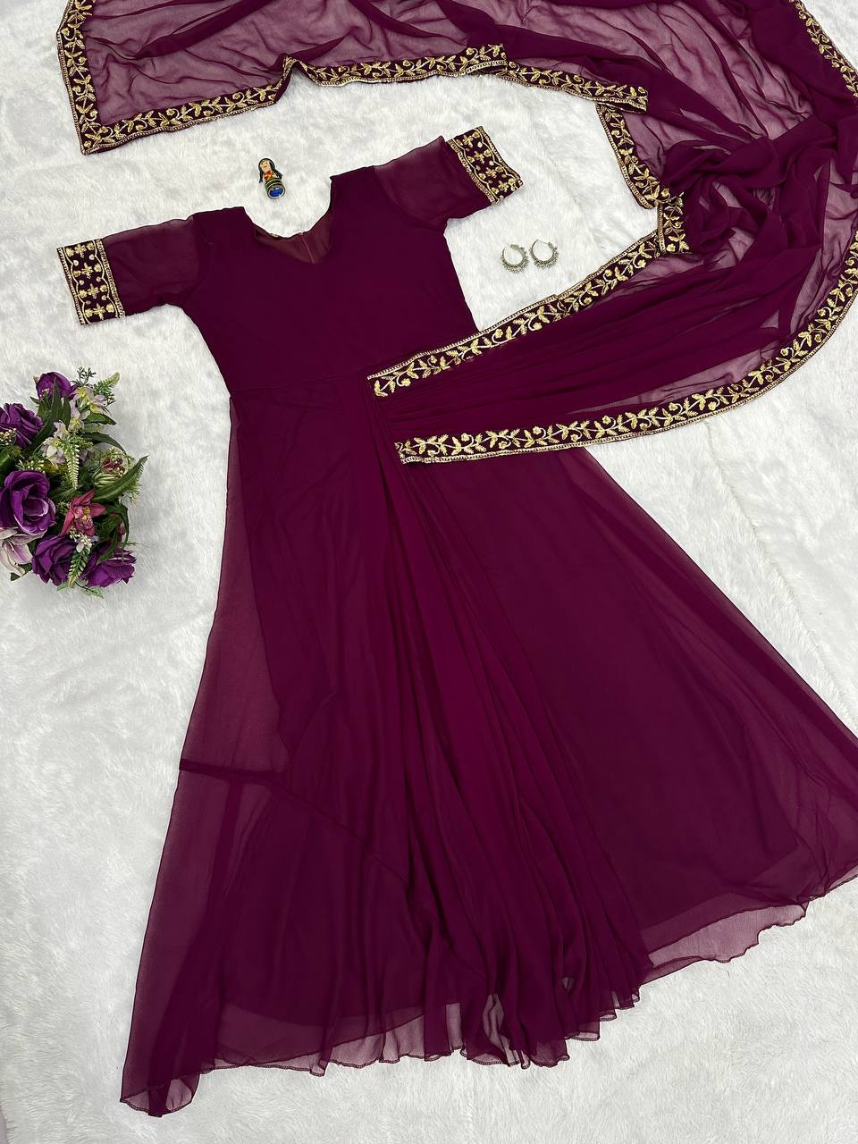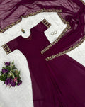 Elegant Faux Georgette Gown with Embroidered Lace Dupatta & Pleated Flair (Marron)