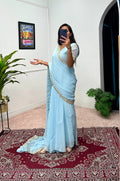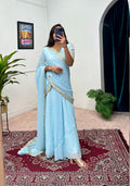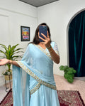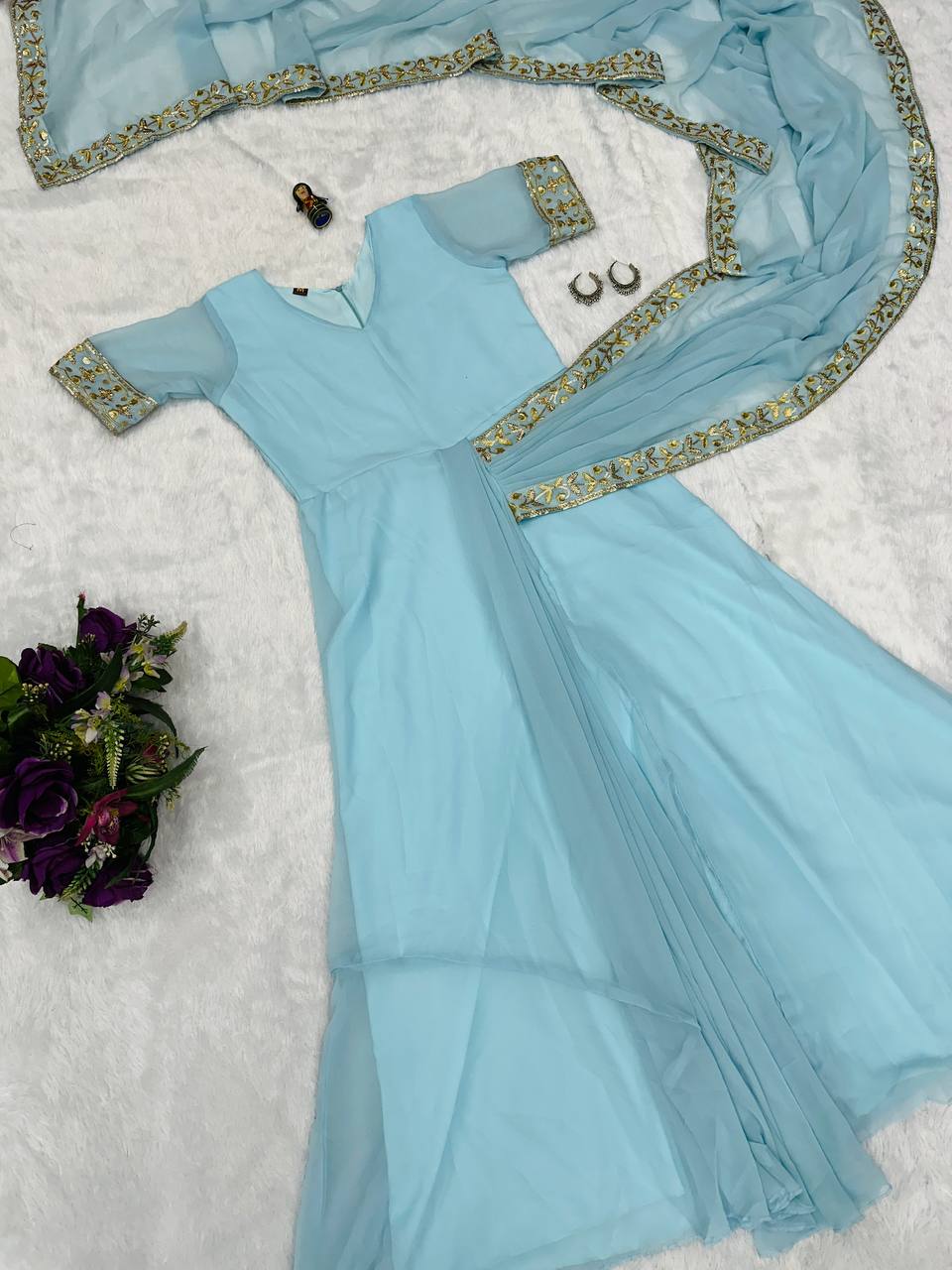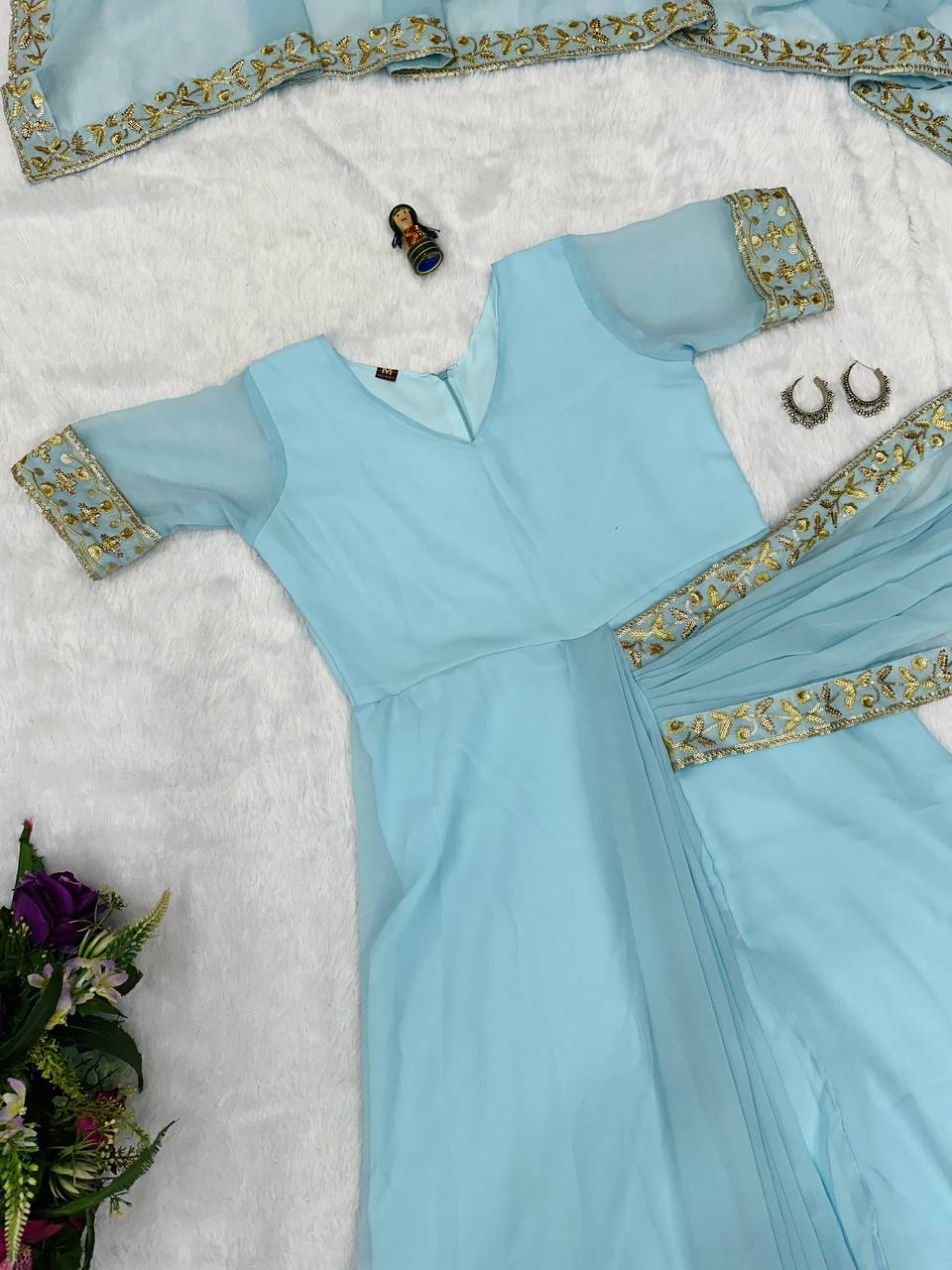 Elegant Faux Georgette Gown with Embroidered Lace Dupatta & Pleated Flair (Sky Blue)
