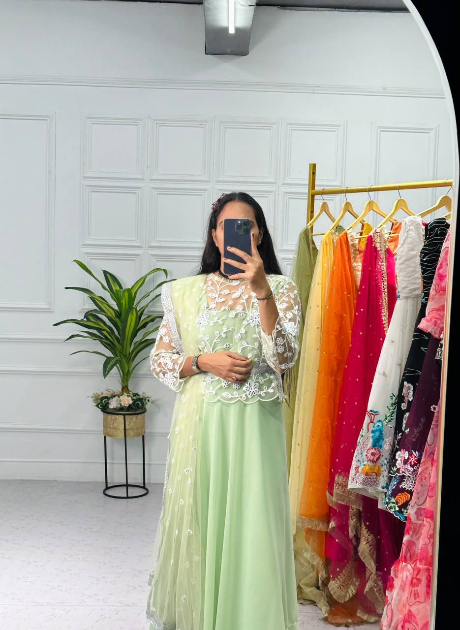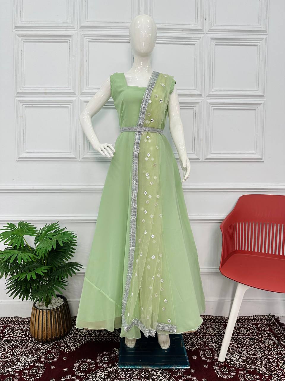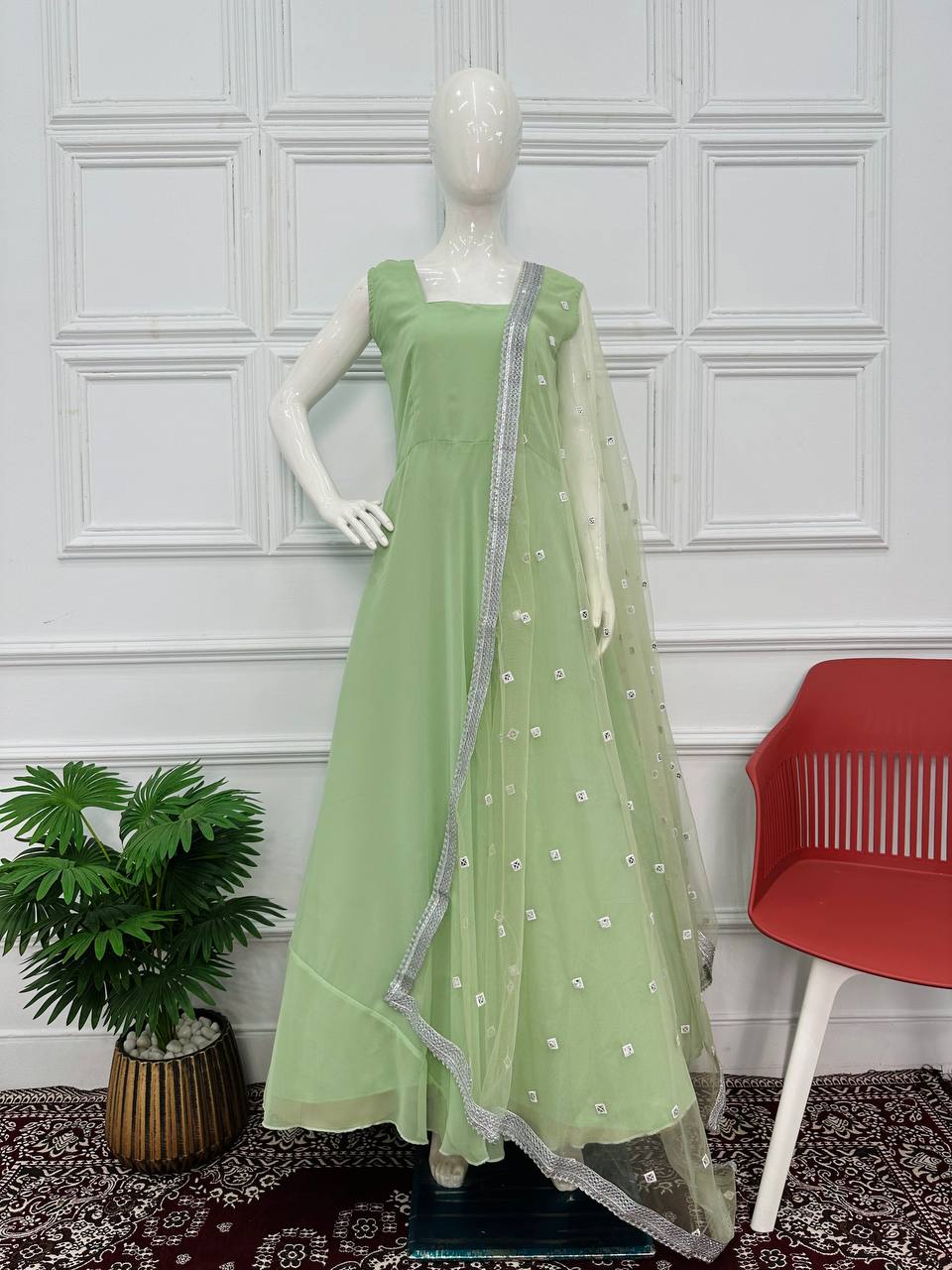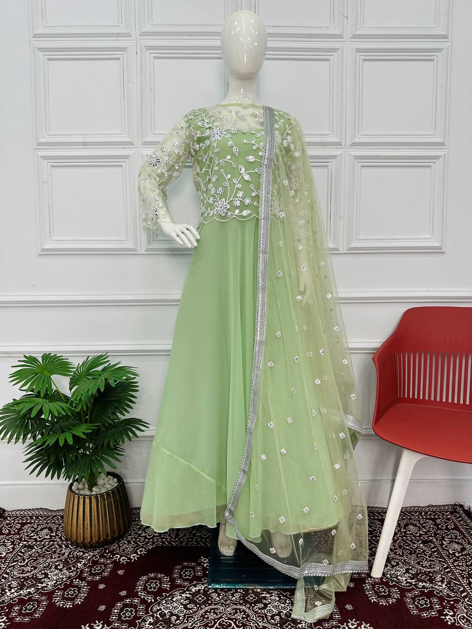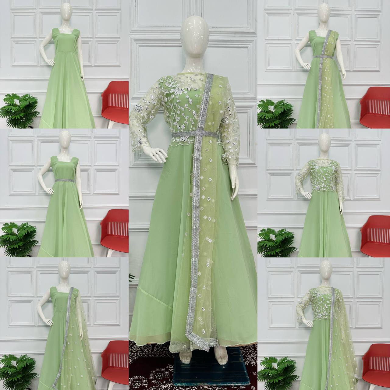 Embroidered Faux Georgette Gown with Net Dupatta and Koti