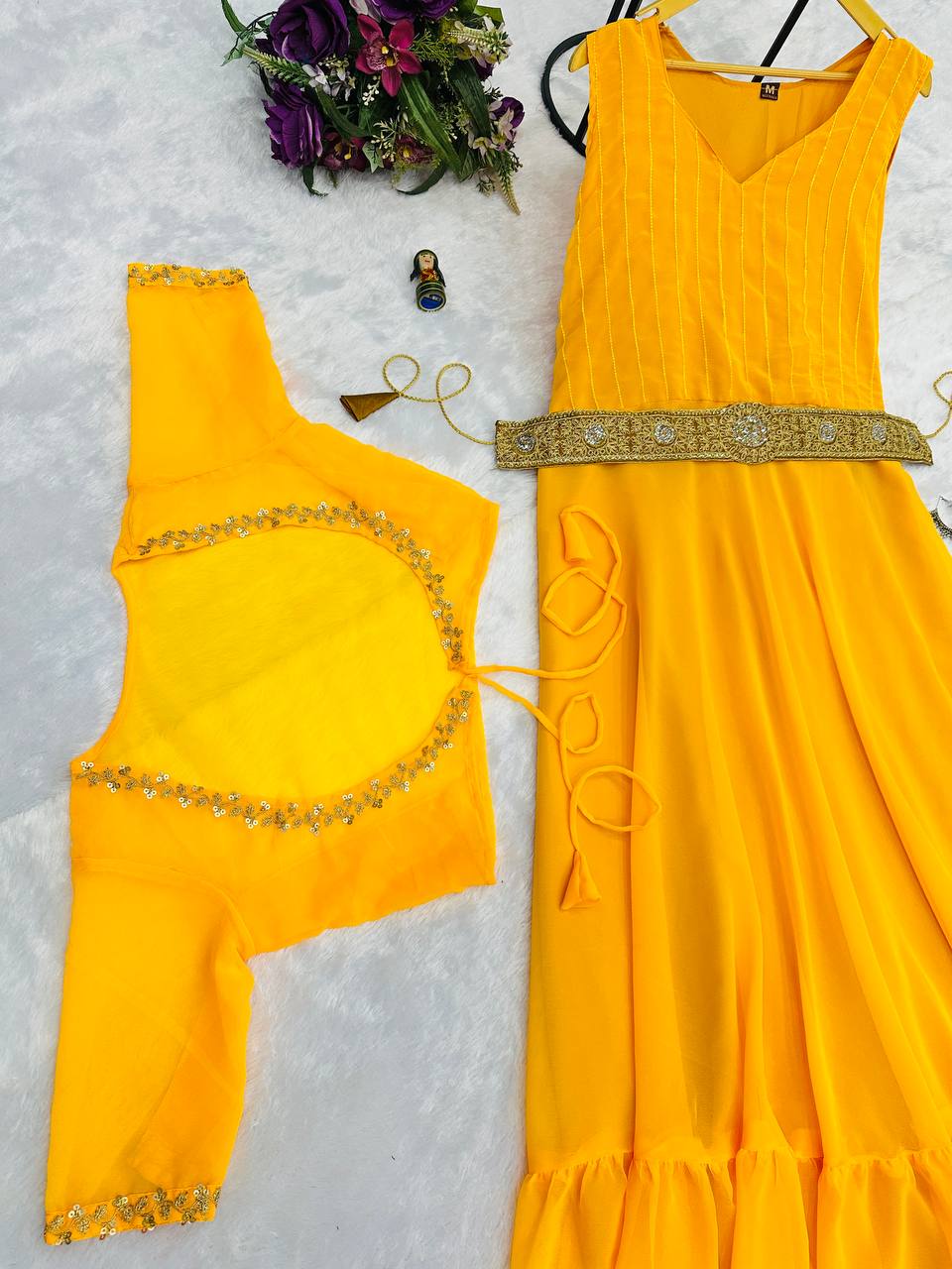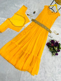 Embroidered Faux Georgette Gown with Ruffle Flair & Matching Koti (Yellow)