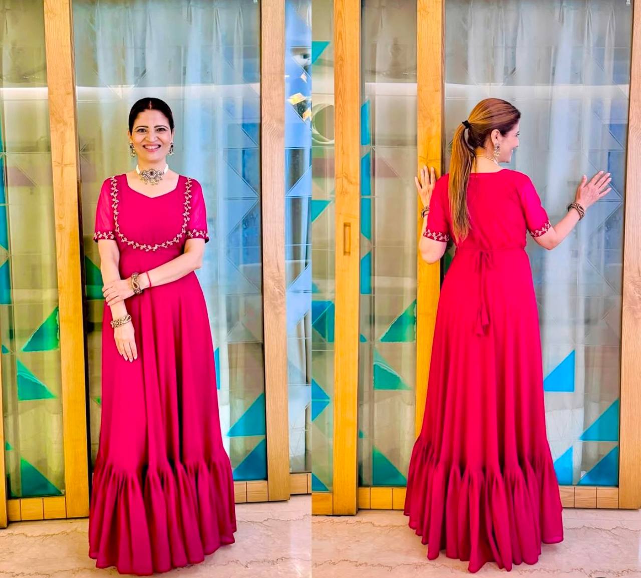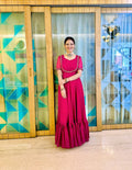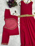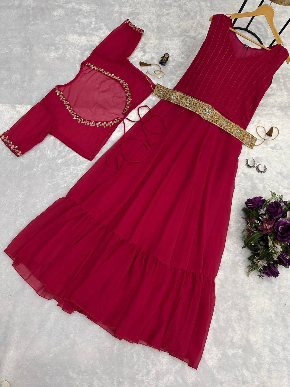 Embroidered Faux Georgette Gown with Ruffle Flair & Matching Koti (Red)