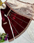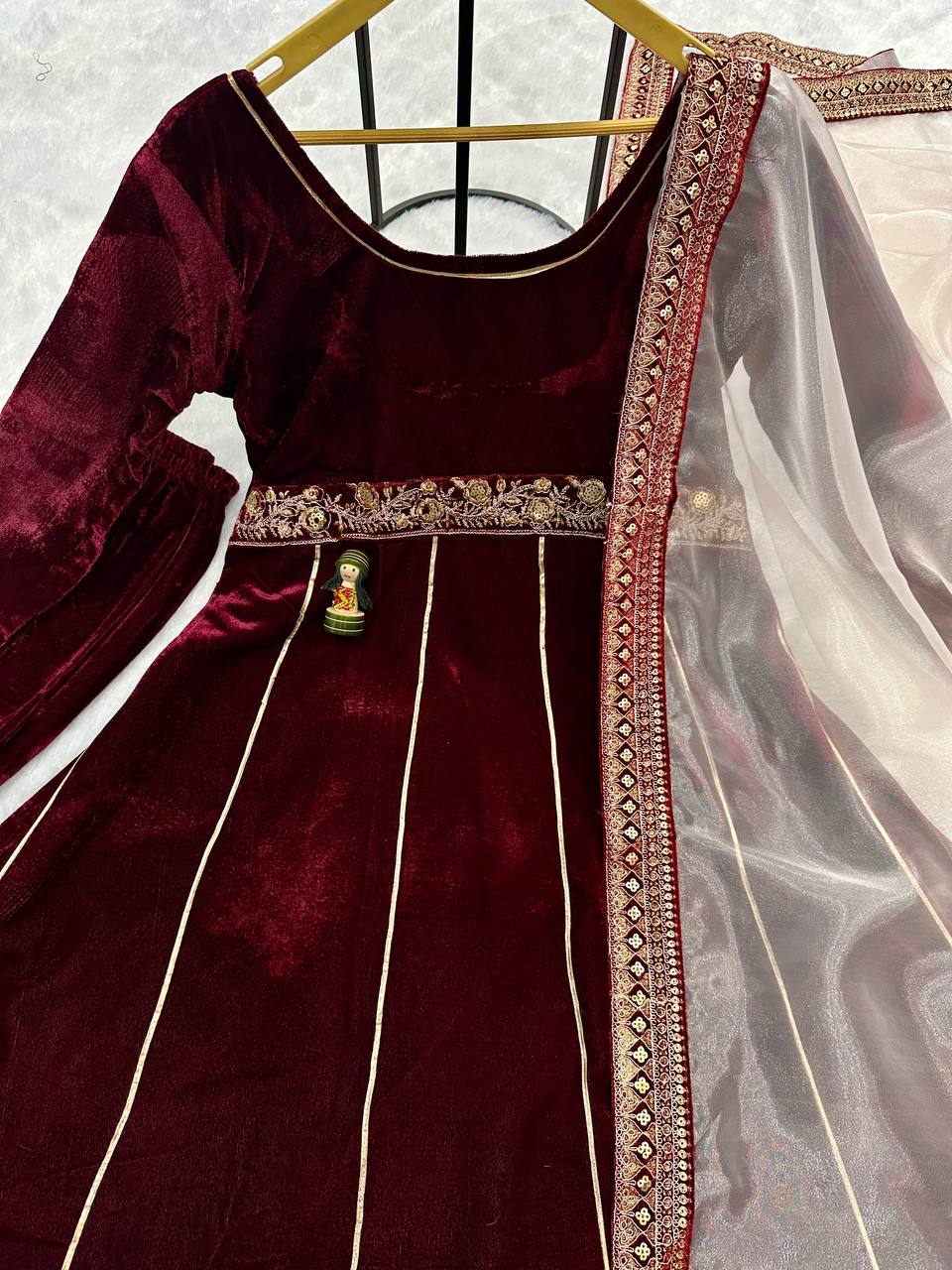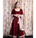Embroidered Velvet Gown Set with Organza Silk Dupatta and Matching Velvet Pants