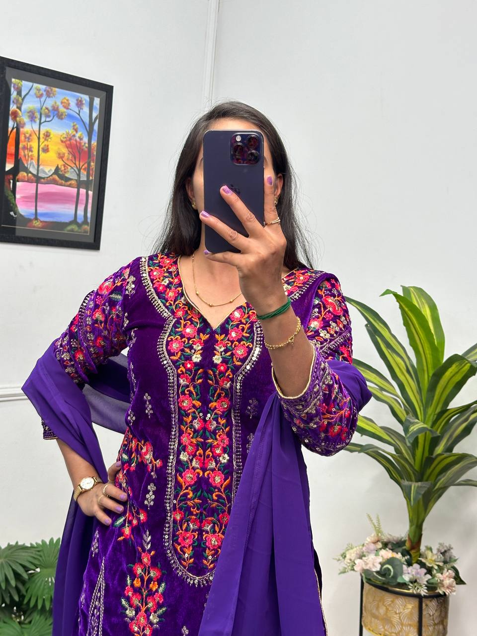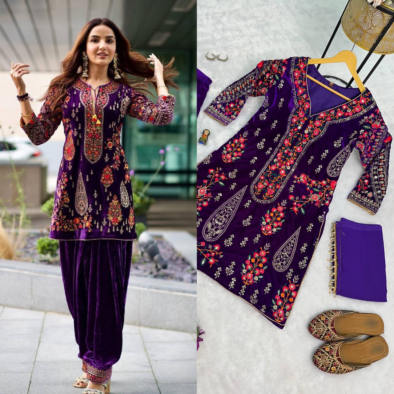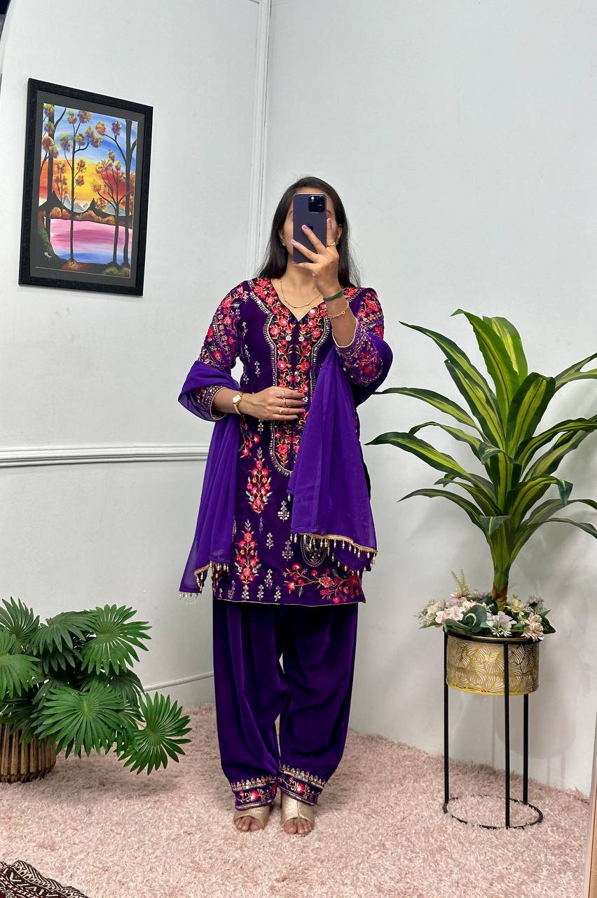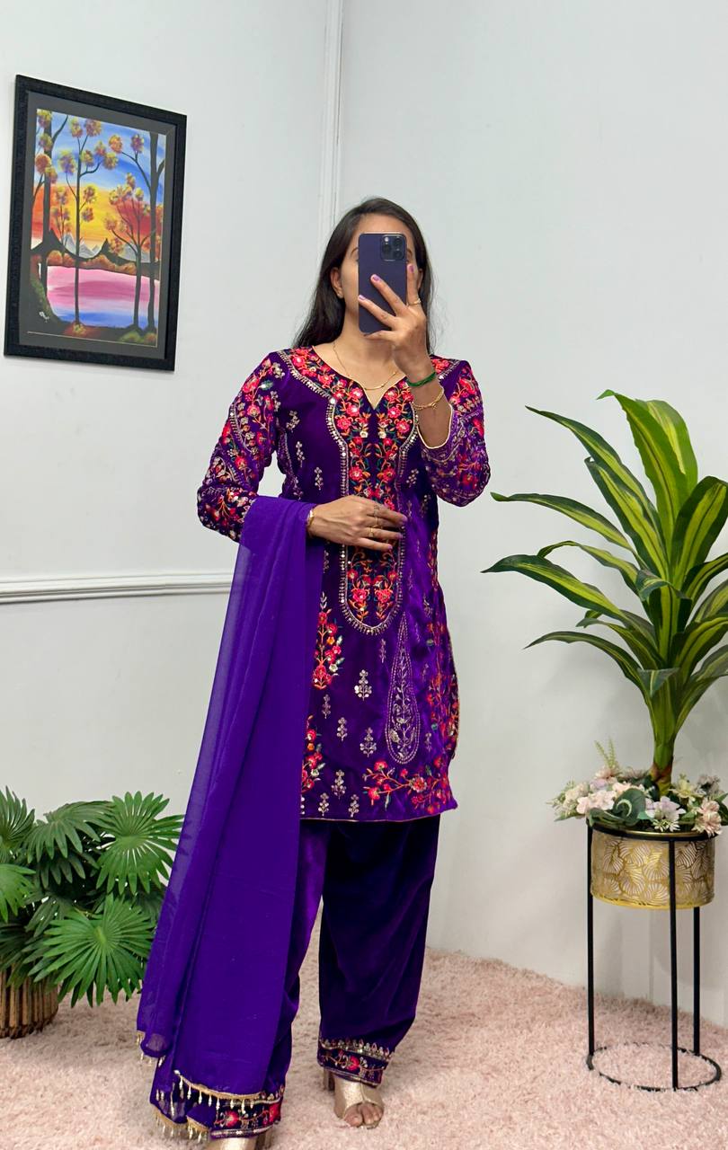 Embroidered Velvet Kurti Set with Georgette Dupatta and Fancy Patiala