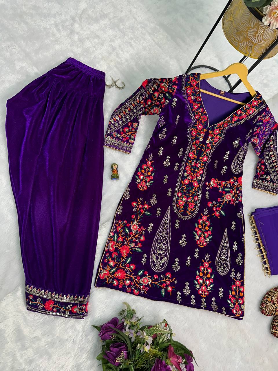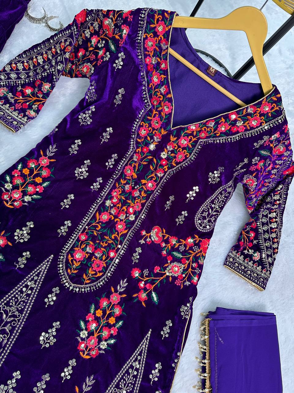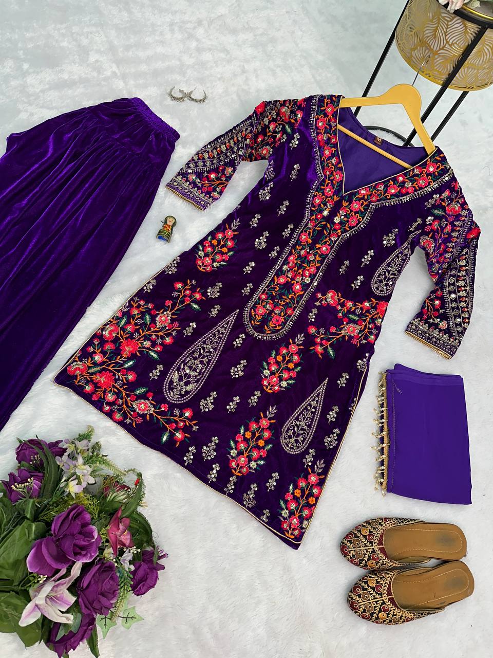 Embroidered Velvet Kurti Set with Georgette Dupatta and Fancy Patiala