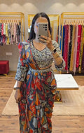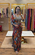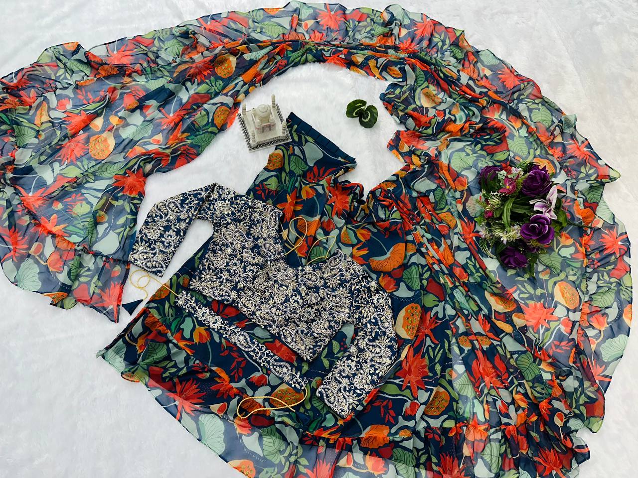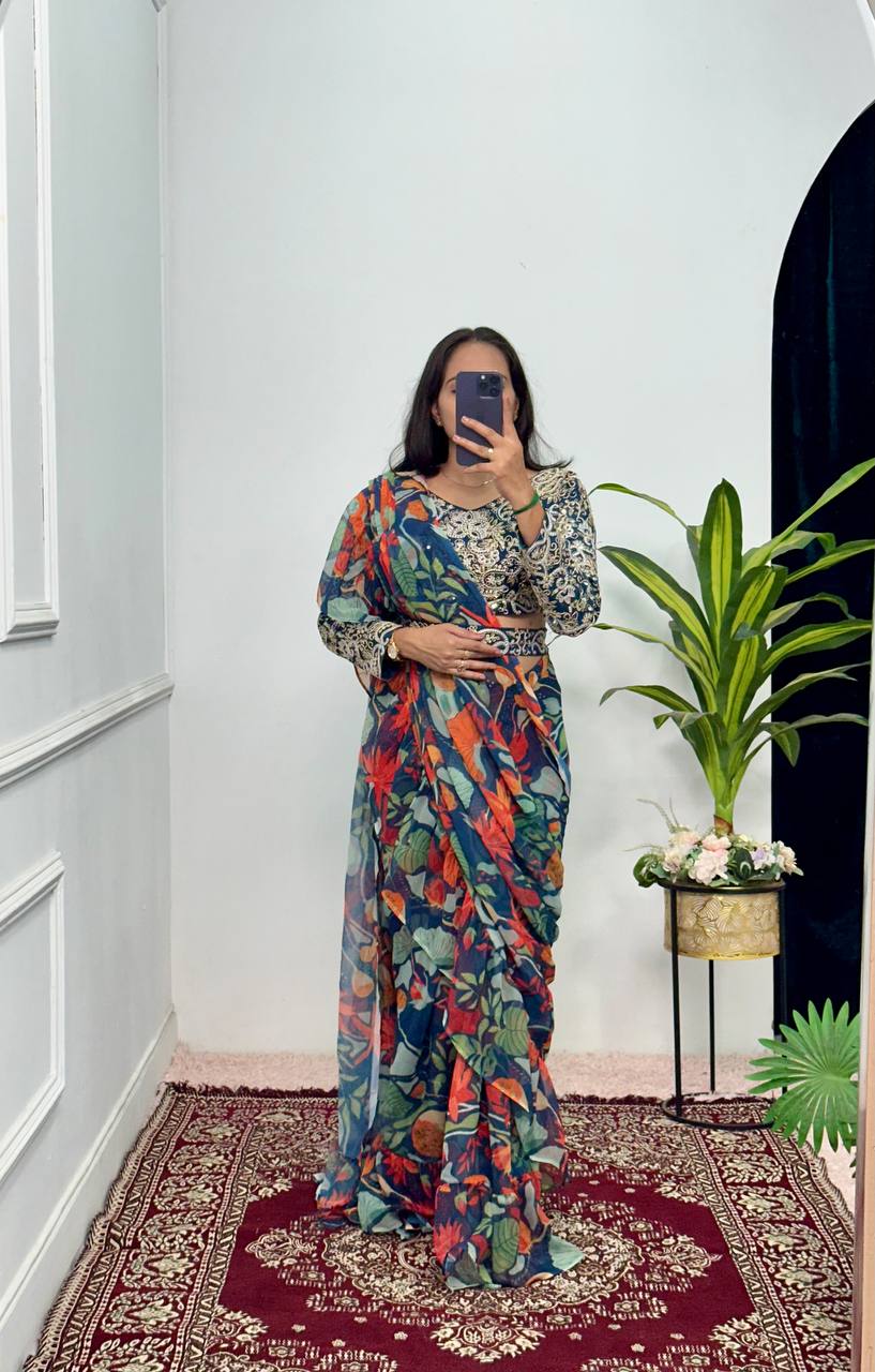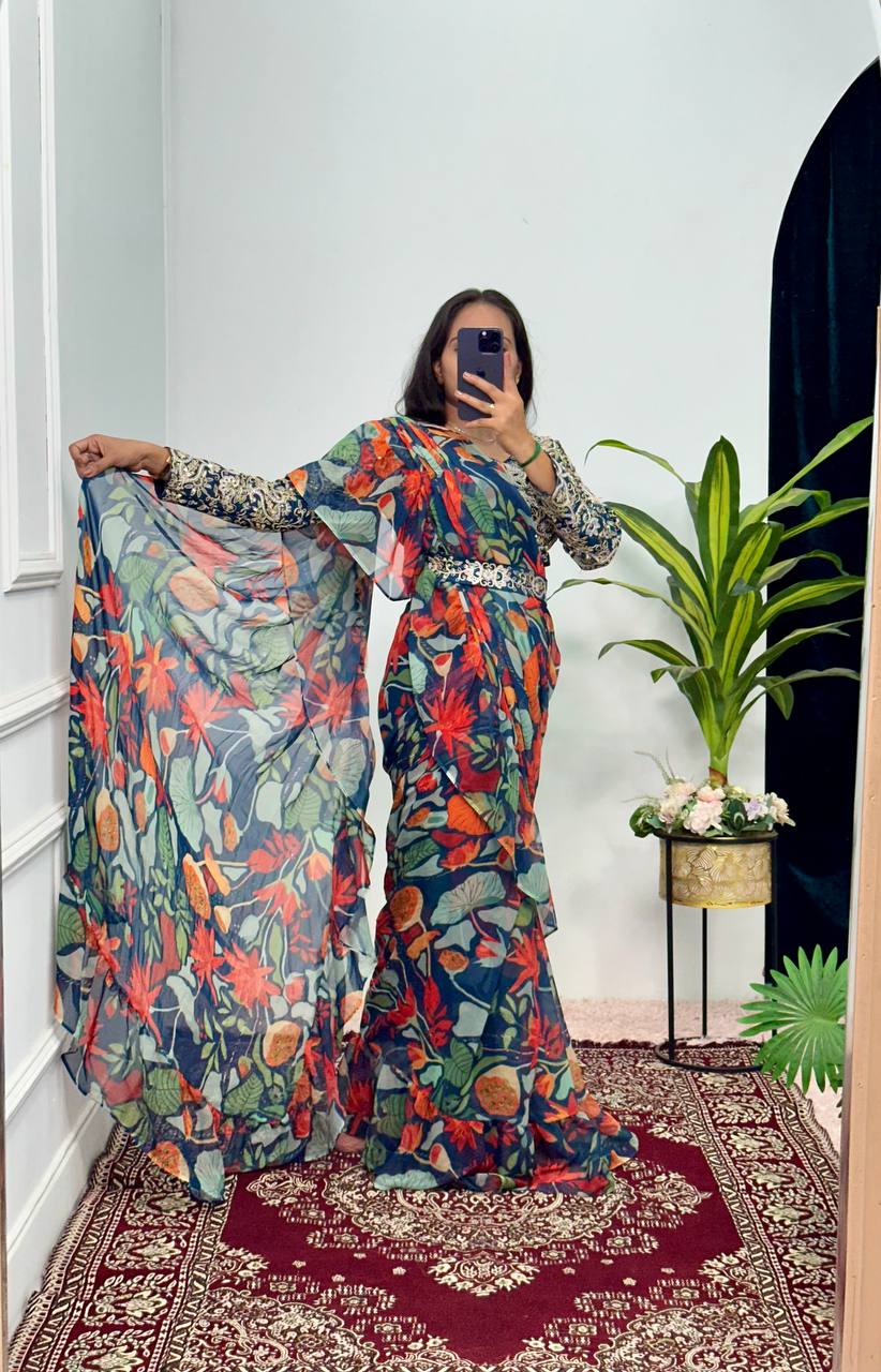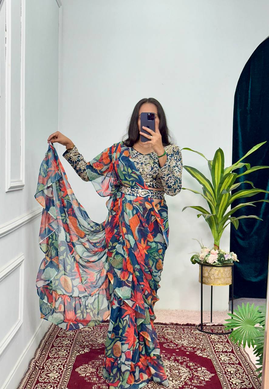 Party Wear Georgette Saree with Ruffle Border & Stitched Embroidered Blouse