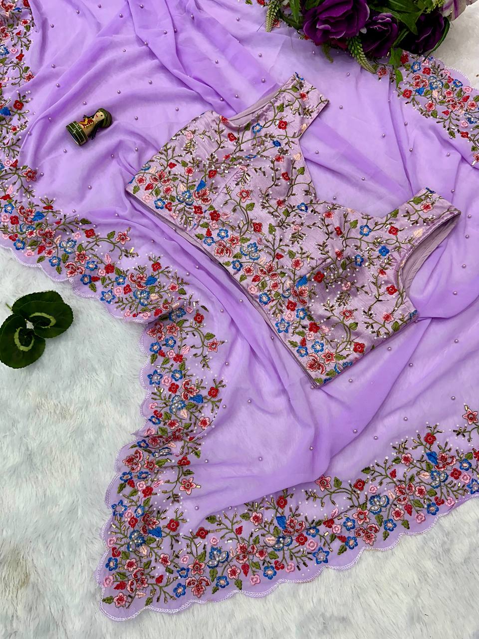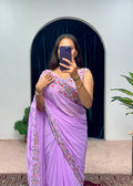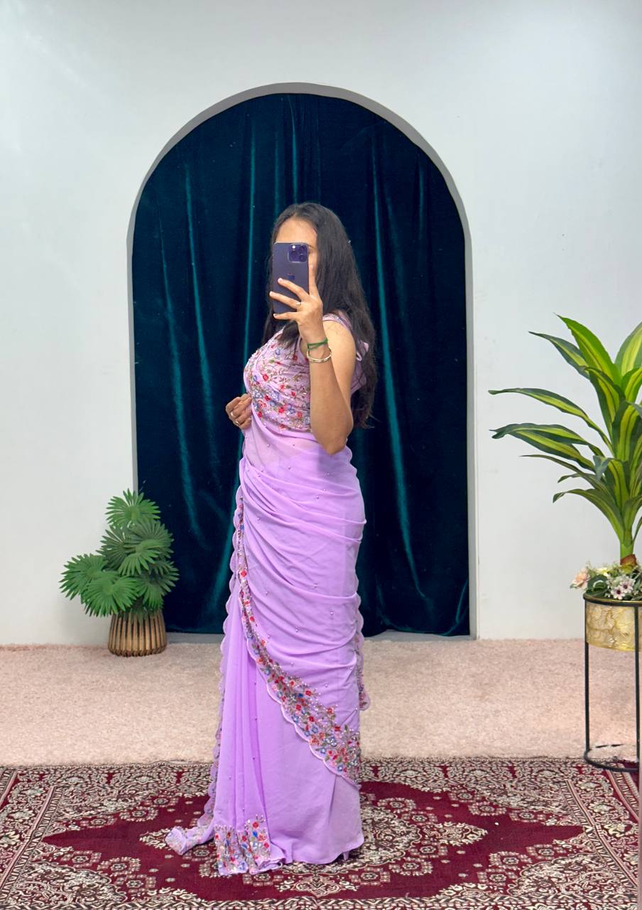 Premium Embroidered Faux Georgette Saree with Traditional Handwork Border (Purple)