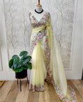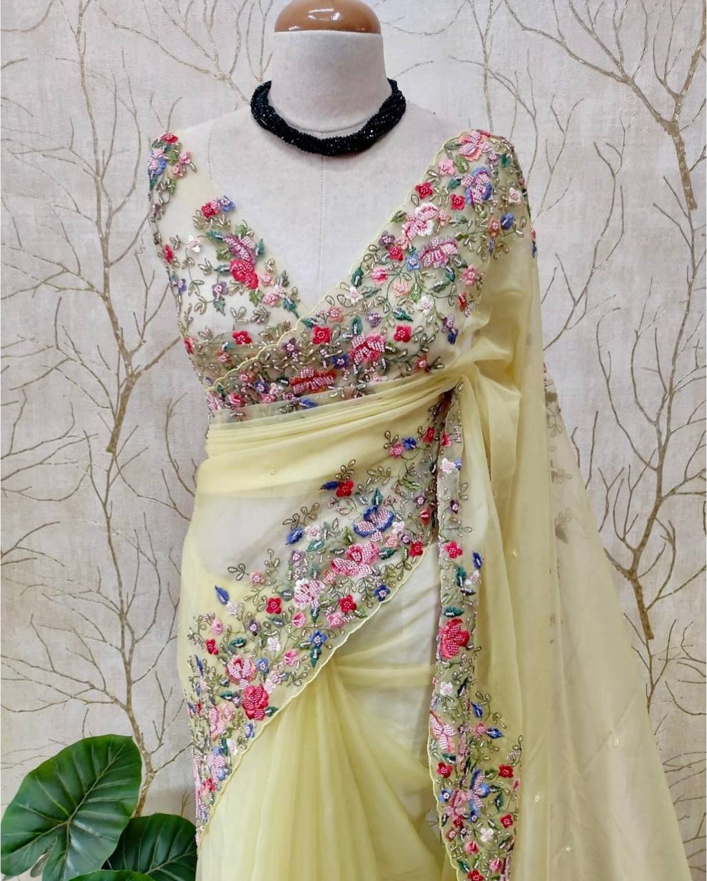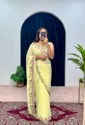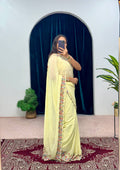 Premium Embroidered Faux Georgette Saree with Traditional Handwork Border (Light Yellow)