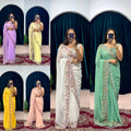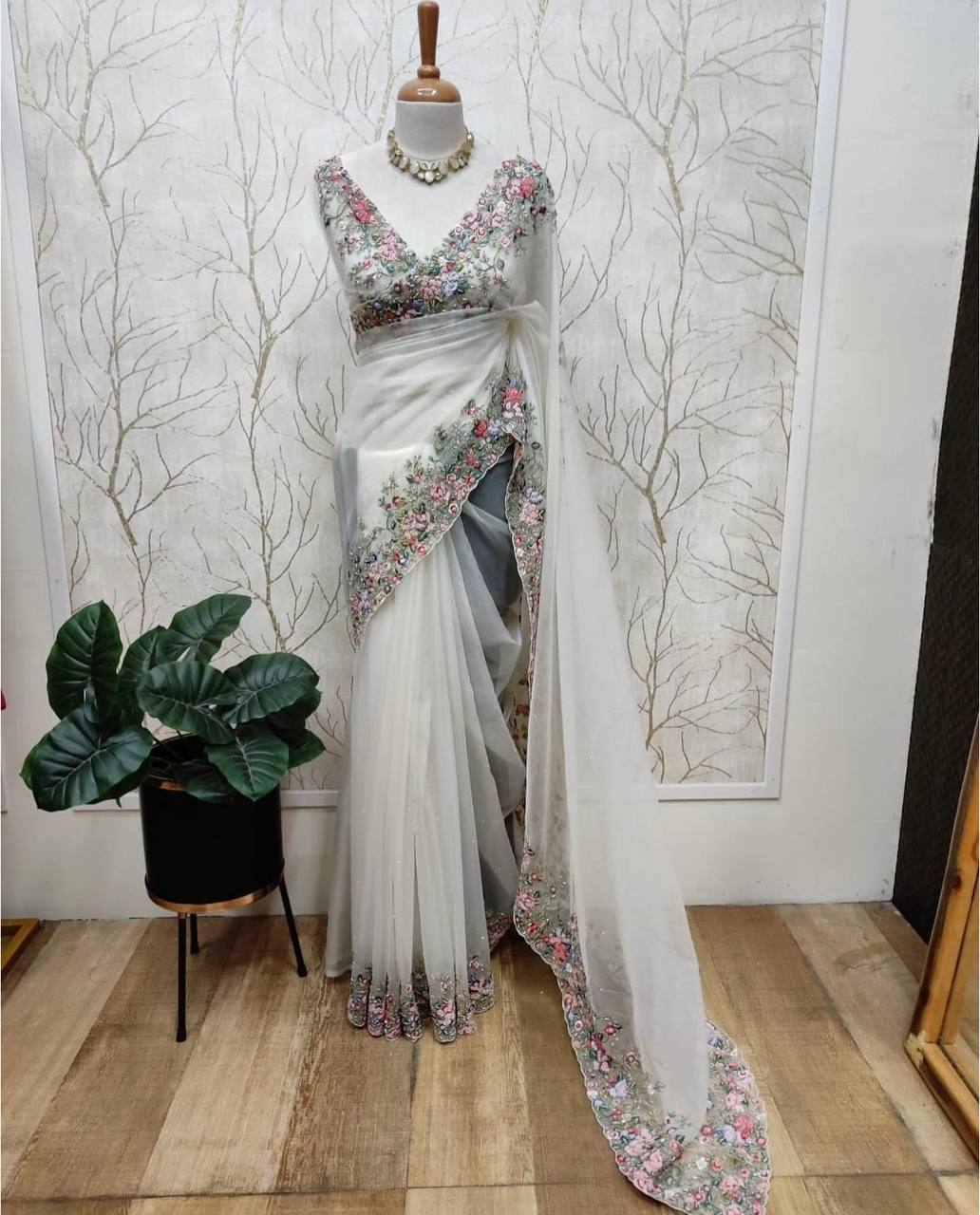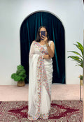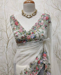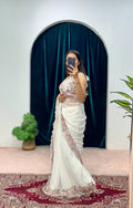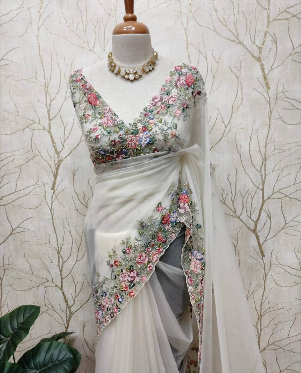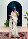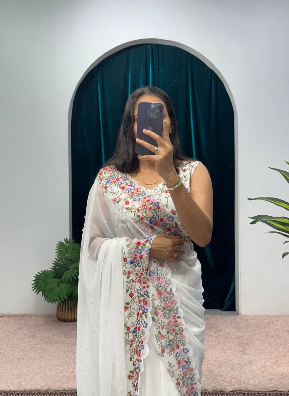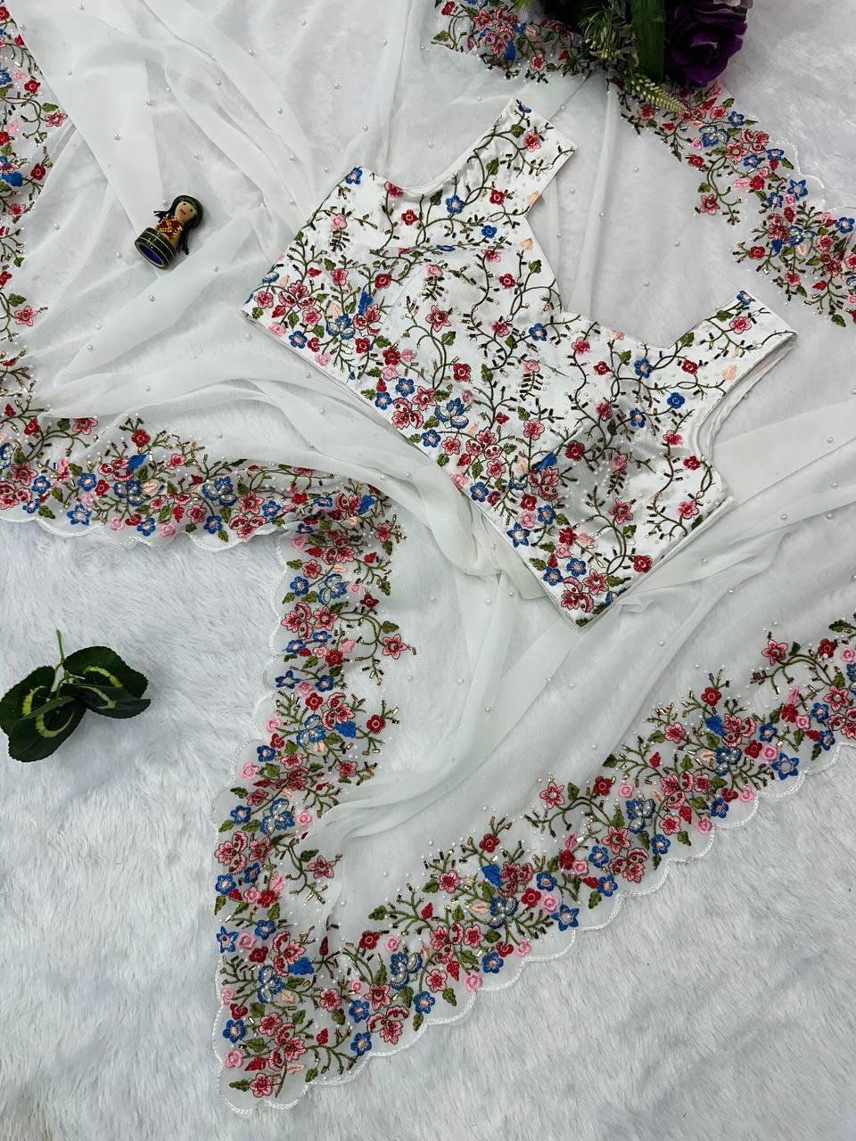 Premium Embroidered Faux Georgette Saree with Traditional Handwork Border (White)