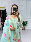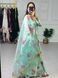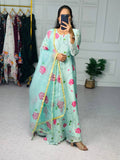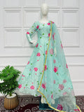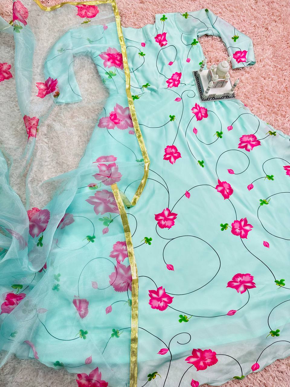 Stylish Satin Georgette Gown with Lace Border Digital Print Dupatta (Sky Blue)