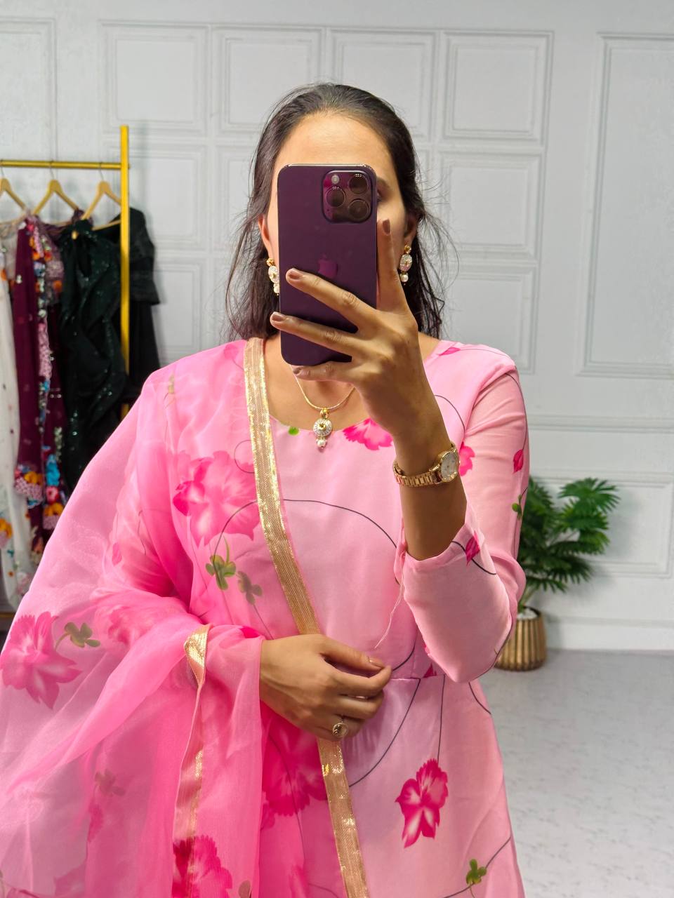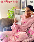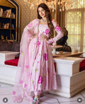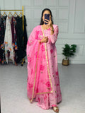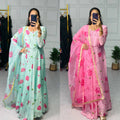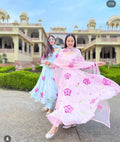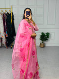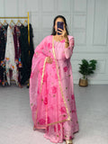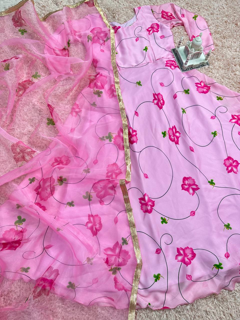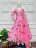 Stylish Satin Georgette Gown with Lace Border Digital Print Dupatta (Pink)