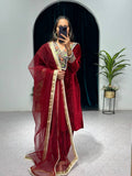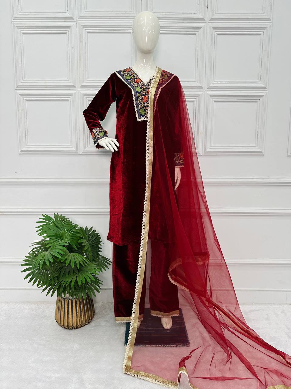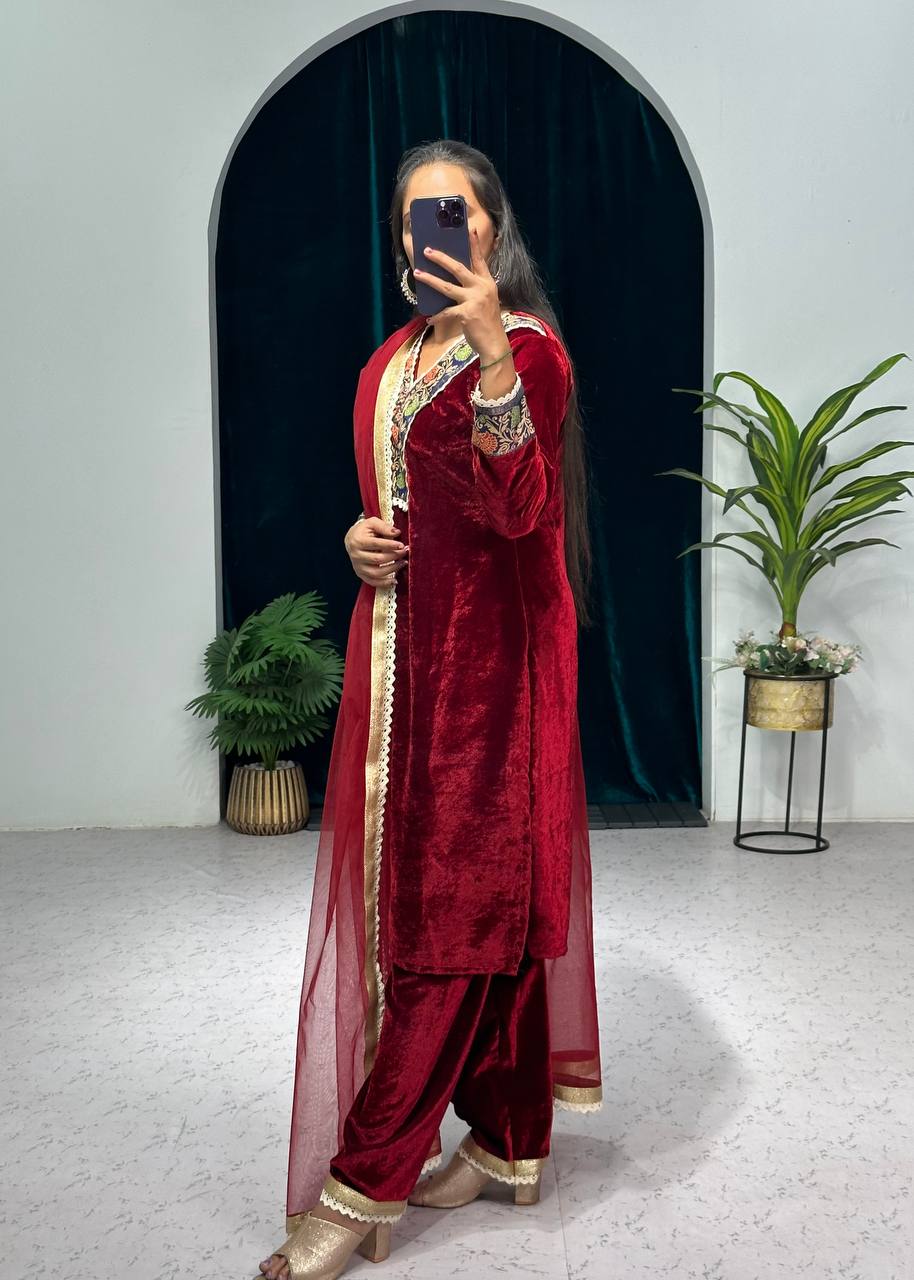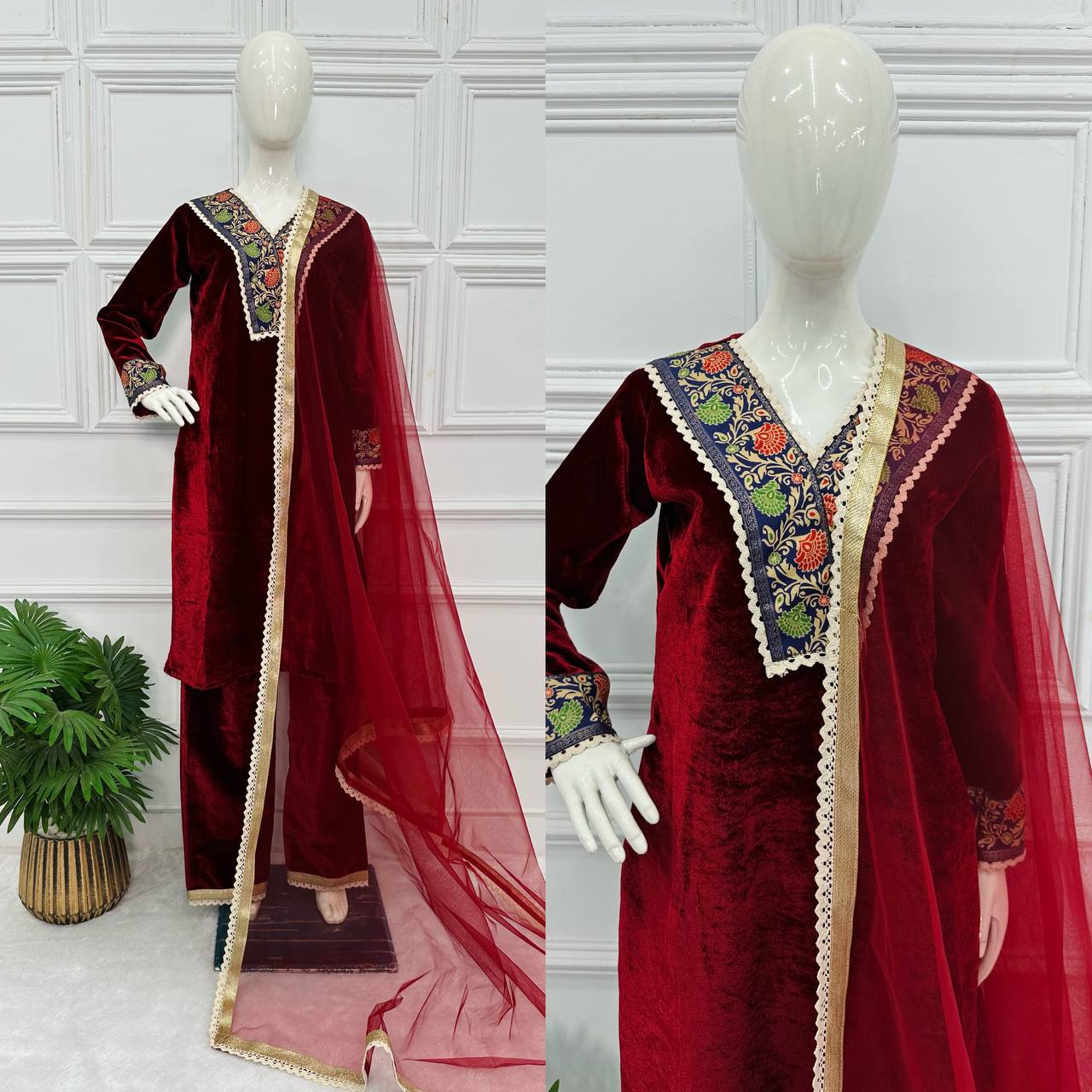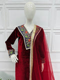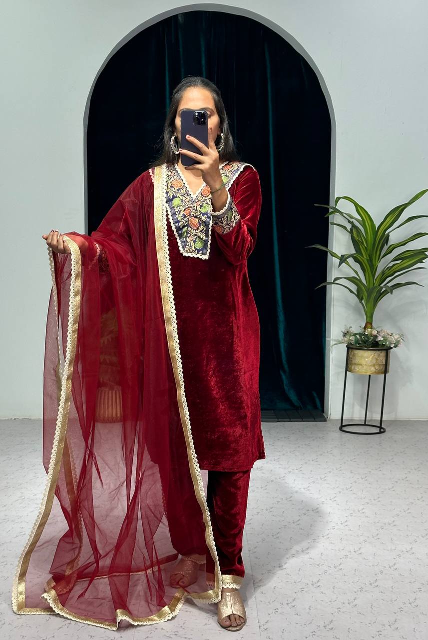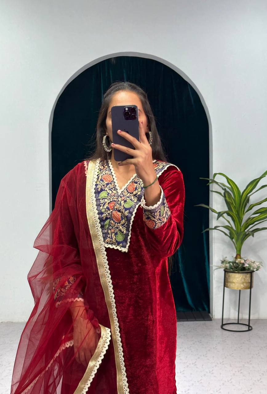 Stylish Velvet Kurti with Jaquard Lace Border, Soft Net Dupatta, and Velvet Pants (Red)
