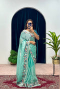 Traditional Blooming Rangoli Saree with Pearl Work & Cut Border (Sky Blue)