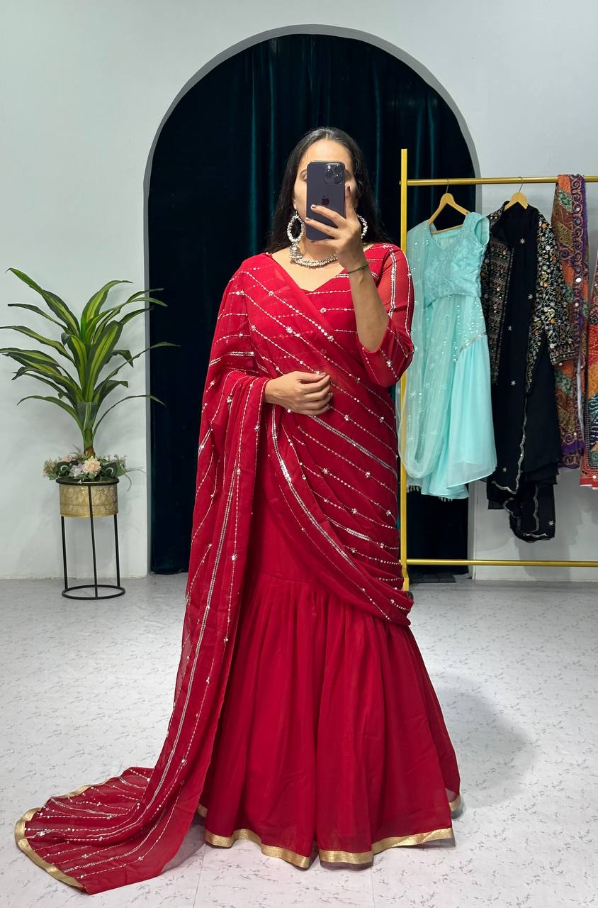 Traditional Lehenga Saree Set with Full Embroidery & Faux Georgette Blouse (Brown)